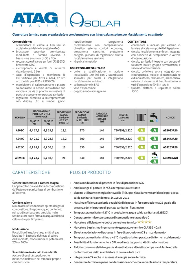 • Temperatura uscita fumi 27°C in produzione acqua calda sanitaria (A325ECO)