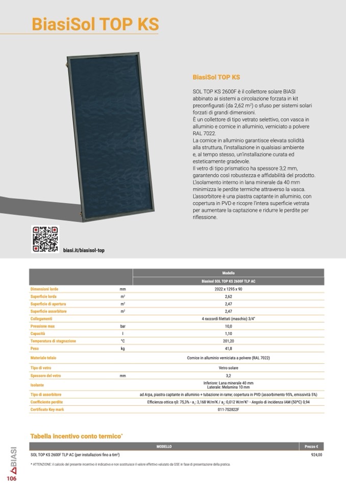 ad Arpa, piastra captante in alluminio + tubazione in rame; copertura in PVD (assorbimento 95%, emissività 5%)