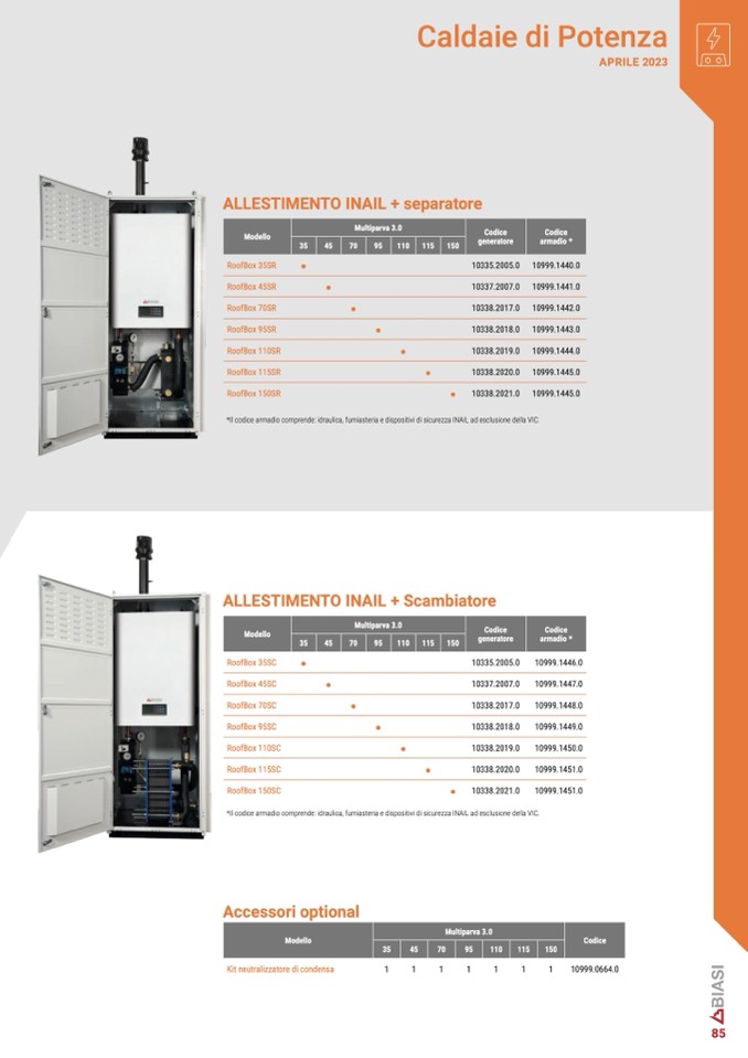 *Il codice armadio comprende: idraulica, fumiasteria e dispositivi di sicurezza INAIL ad esclusione della VIC.