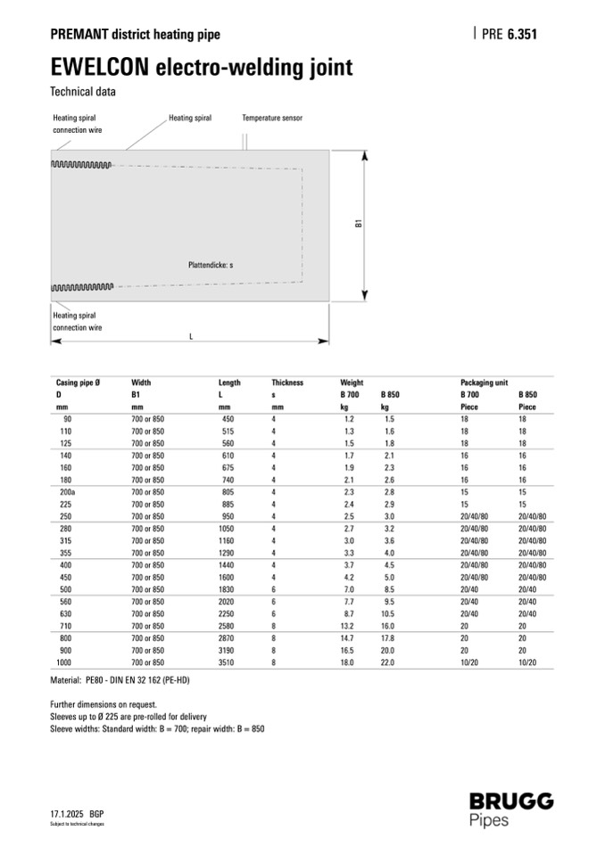 Sleeve widths: Standard width: B = 700; repair width: B = 850