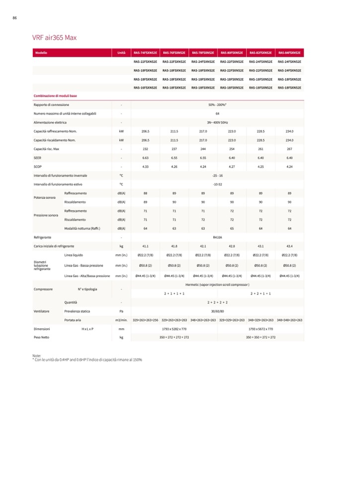 * Con le unità da 0.4HP and 0.6HP l’indice di capacità rimane al 150%