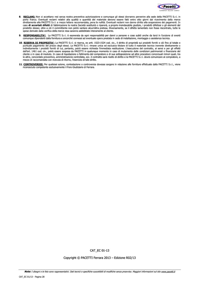 direttamente alla PACETTI S.r.l. a mezzo lettera raccomandata, pena la nullità. Eventuali reclami non danno diritto alla sospensione dei pagamenti. In