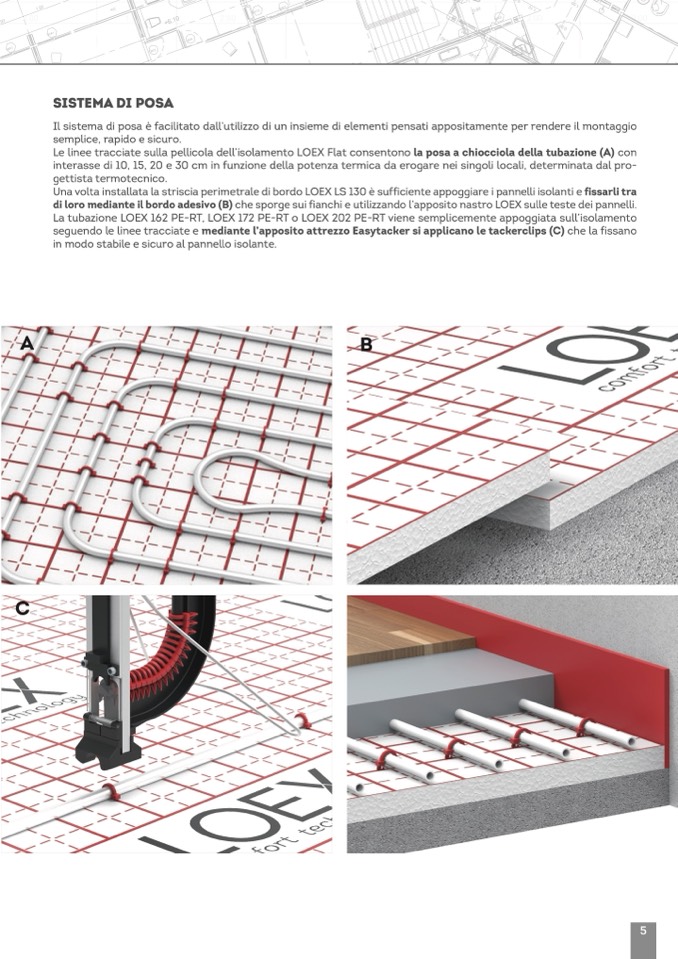 Le linee tracciate sulla pellicola dell’isolamento LOEX Flat consentono la posa a chiocciola della tubazione (A) con