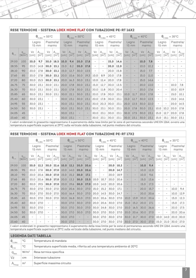 I valori evidenziati in grassetto rappresentano il superamento della resa limite per le zone di permanenza secondo UNI EN 1264, ovvero una