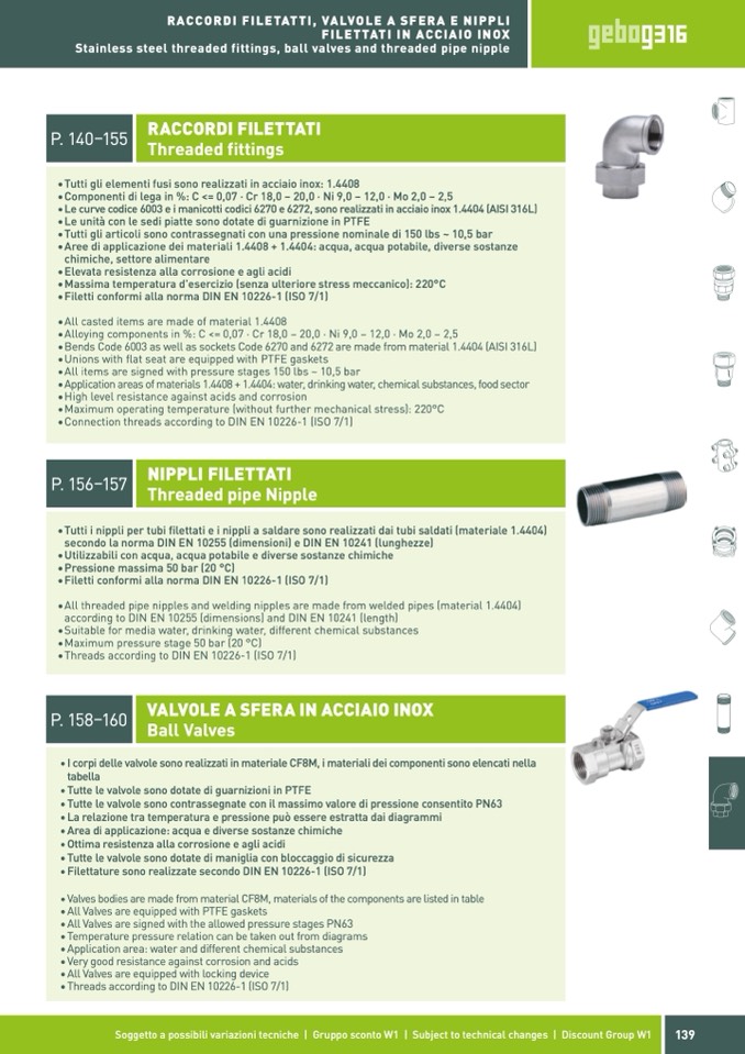 •All threaded pipe nipples and welding nipples are made from welded pipes (material 1.4404)
