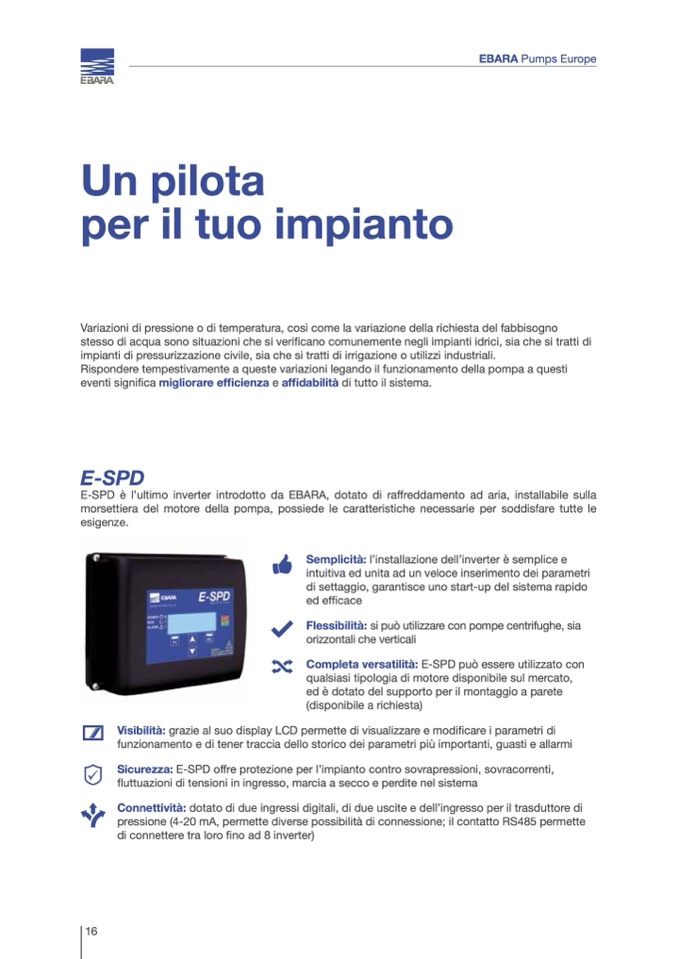 E-SPD è l’ultimo inverter introdotto da EBARA, dotato di raffreddamento ad aria, installabile sulla