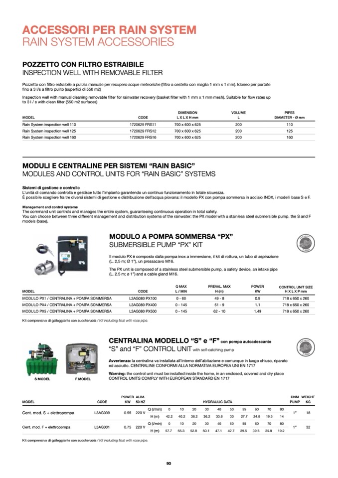 È possibile scegliere fra tre diversi sistemi di gestione e distribuzione dell’acqua piovana: il modello PX con pompa sommersa in acciaio INOX, i modelli base S e F.
