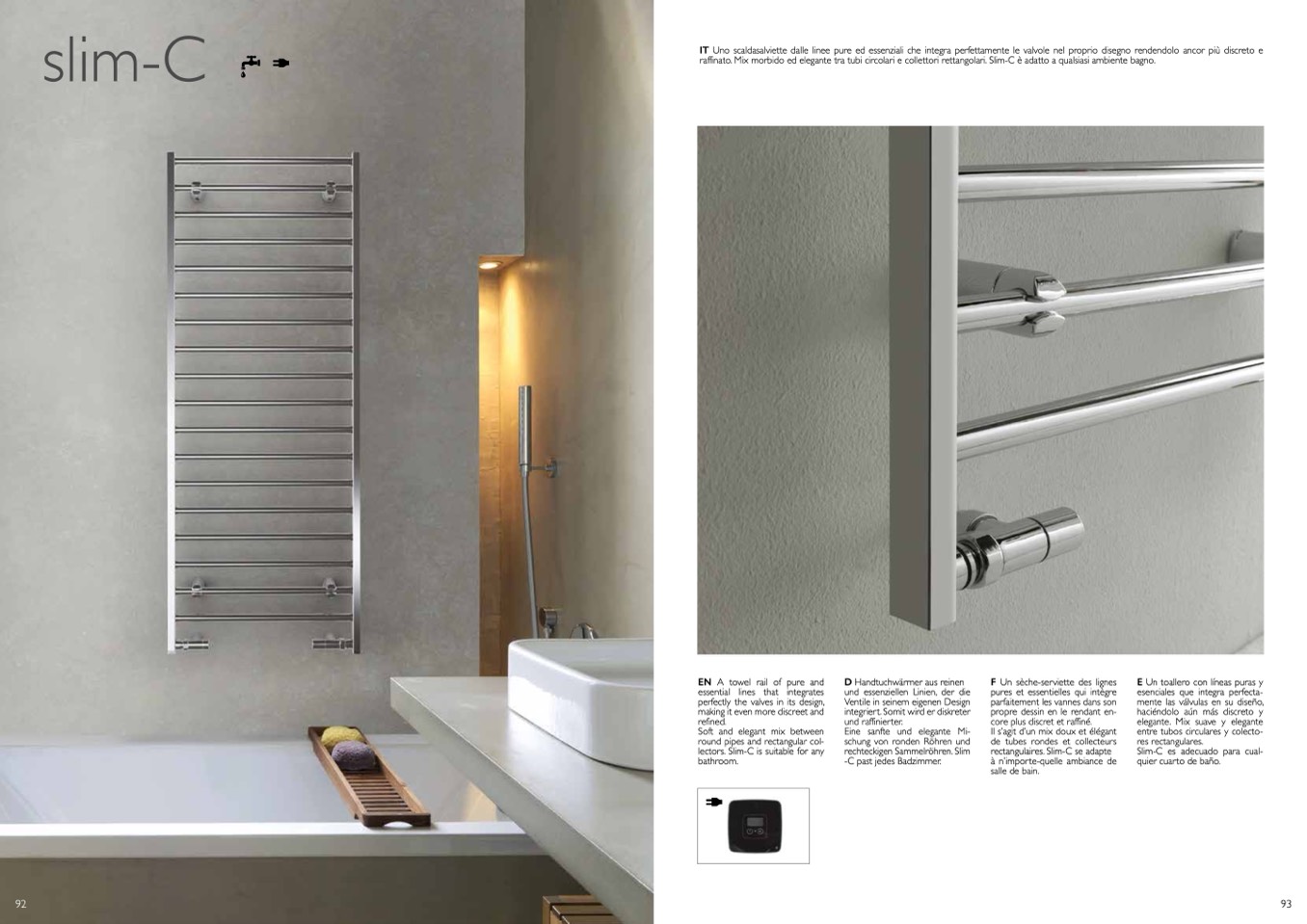raffinato. Mix morbido ed elegante tra tubi circolari e collettori rettangolari. Slim-C è adatto a qualsiasi ambiente bagno.