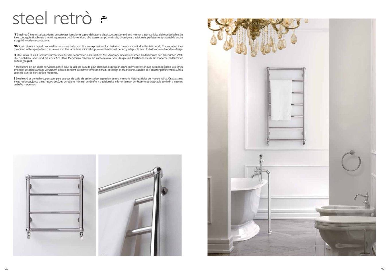 E Steel retrò es un toallero, pensado para cuartos de baño de estilo clásico, expresión de una memoria histórica típica del mundo itálico. Gracias a sus