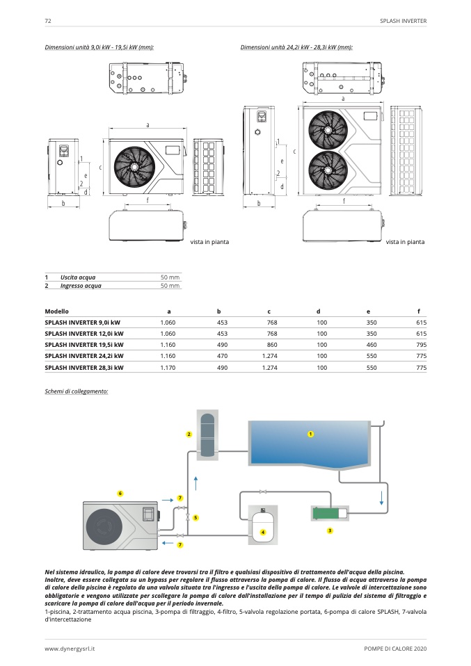 1-piscina, 2-trattamento acqua piscina, 3-pompa di filtraggio, 4-filtro, 5-valvola regolazione portata, 6-pompa di calore SPLASH, 7-valvola