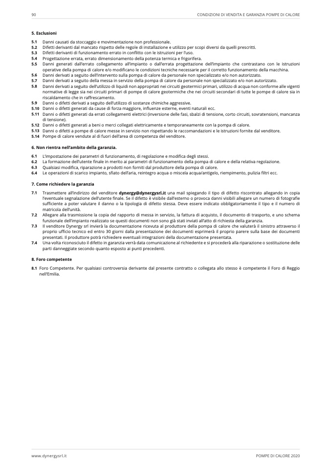 7.3 Il venditore Dynergy srl invierà la documentazione ricevuta al produttore della pompa di calore che valuterà il sinistro attraverso il