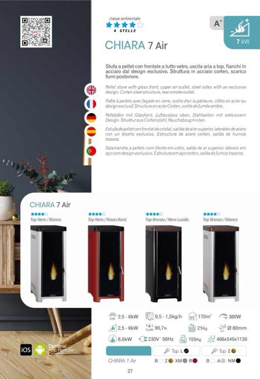 Stufa a pellet con frontale a tutto vetro, uscita aria a top, anchi in
