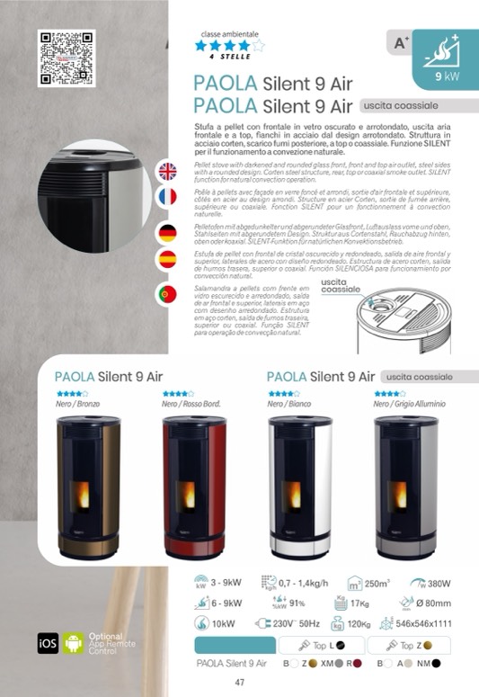 acciaio corten, scarico fumi posteriore, a top o coassiale. Funzione SILENT