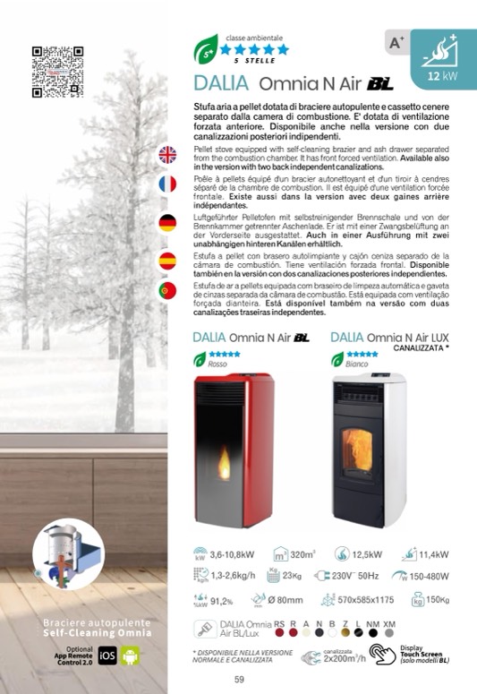 Stufa aria a pellet dotata di braciere autopulente e cassetto cenere