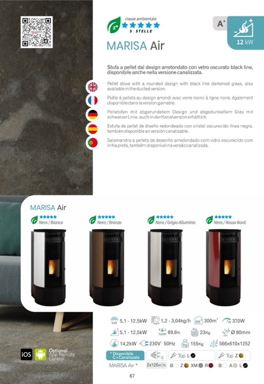 Stufa a pellet dal design arrotondato con vetro oscurato black line,