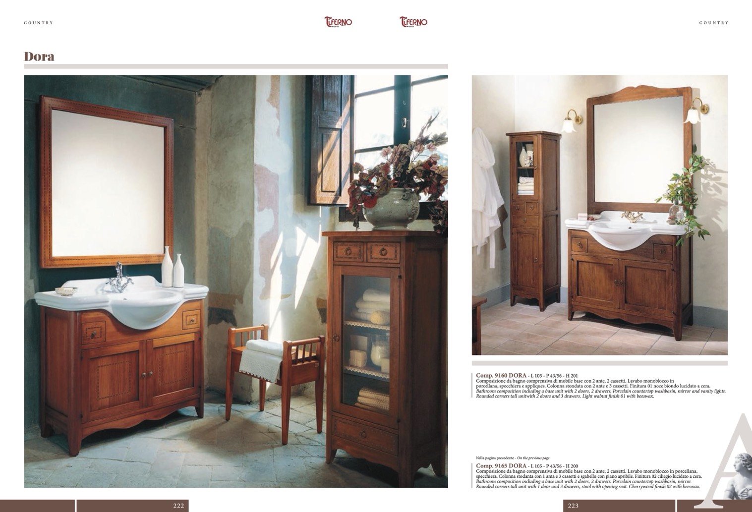 porcellana, specchiera e appliques. Colonna stondata con 2 ante e 3 cassetti. Finitura 01 noce biondo lucidato a cera.