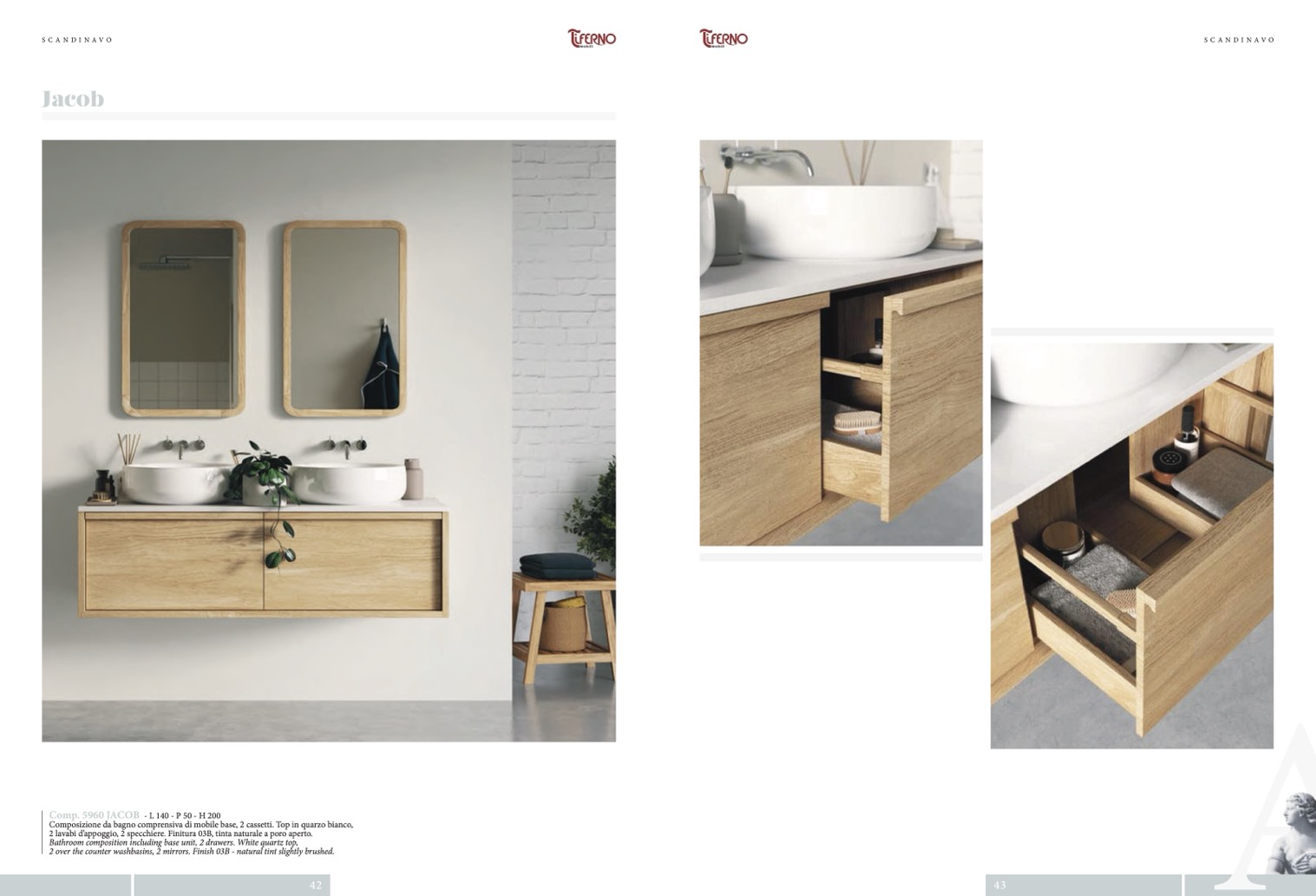 2 lavabi d’appoggio, 2 specchiere. Finitura 03B, tinta naturale a poro aperto.