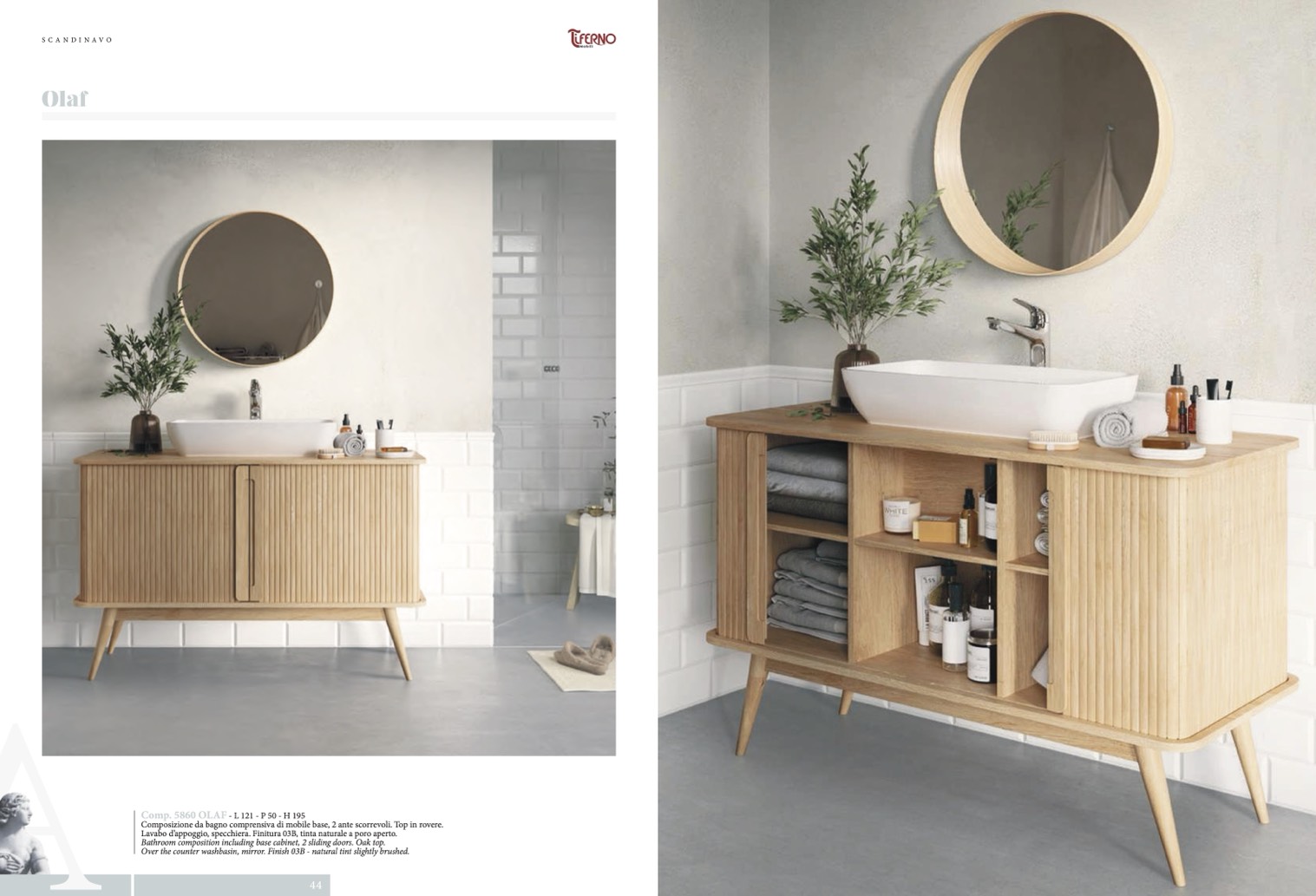 Lavabo d’appoggio, specchiera. Finitura 03B, tinta naturale a poro aperto.