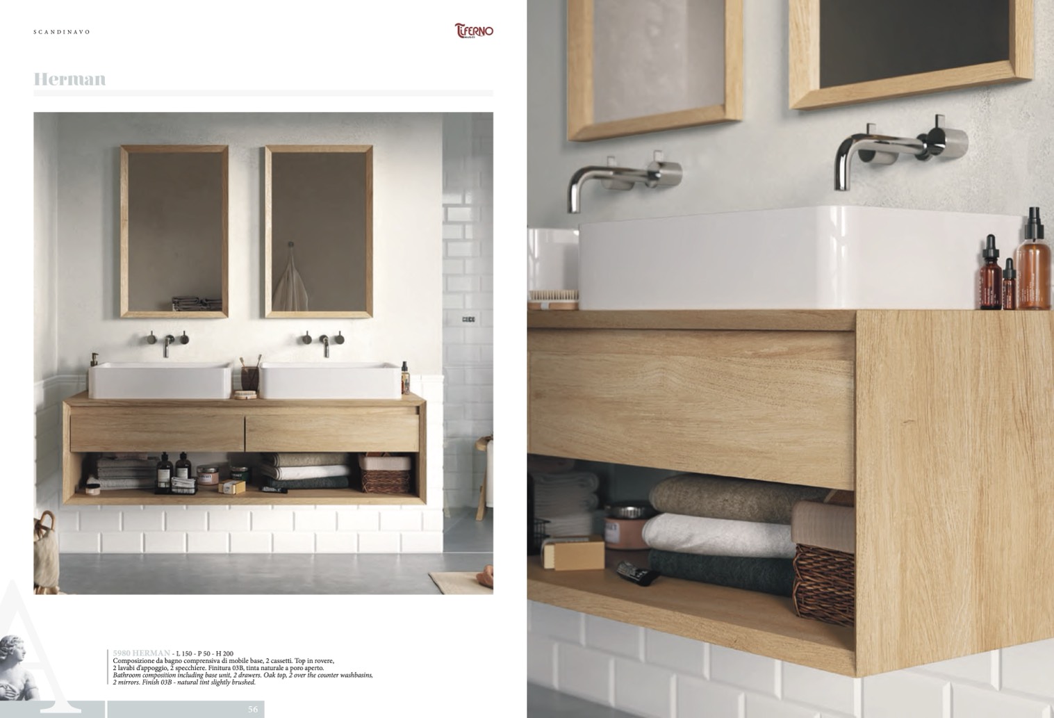 2 lavabi d’appoggio, 2 specchiere. Finitura 03B, tinta naturale a poro aperto.