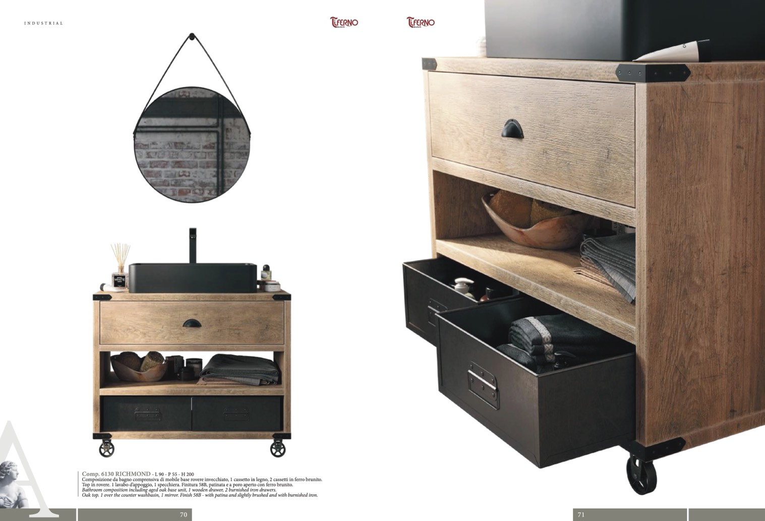 Top in rovere. 1 lavabo d’appoggio, 1 specchiera. Finitura 58B, patinata e a poro aperto con ferro brunito.
