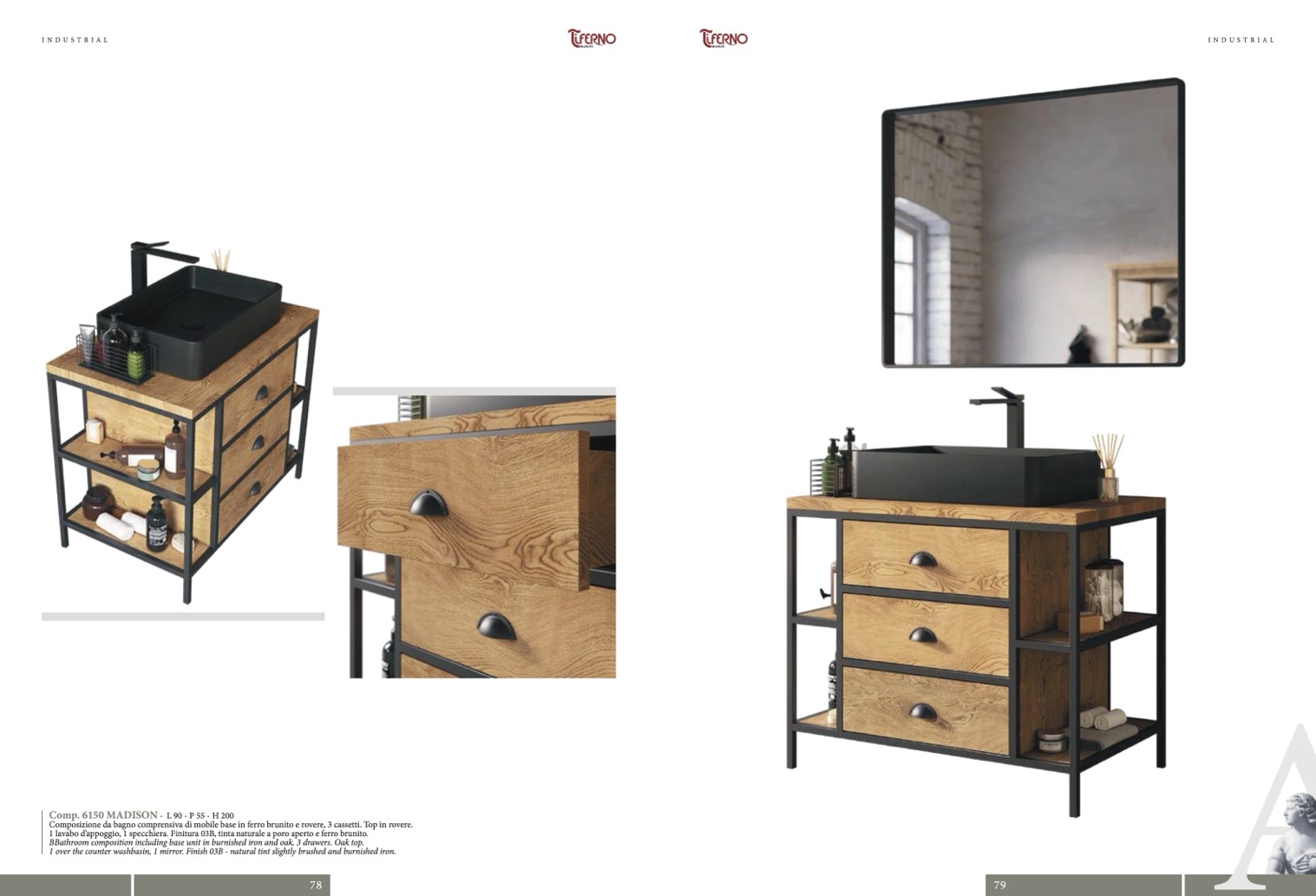 1 lavabo d’appoggio, 1 specchiera. Finitura 03B, tinta naturale a poro aperto e ferro brunito.