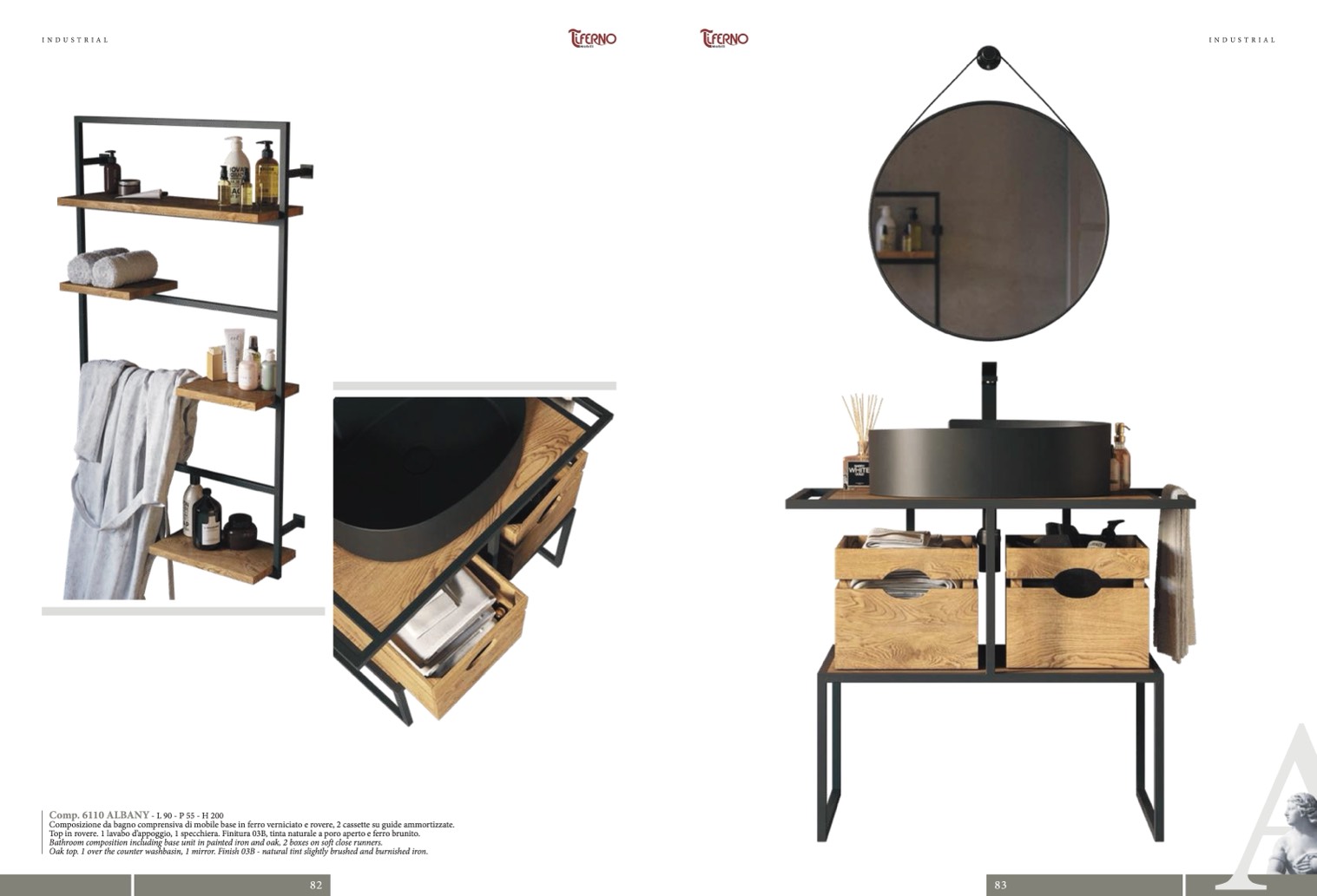 Top in rovere. 1 lavabo d’appoggio, 1 specchiera. Finitura 03B, tinta naturale a poro aperto e ferro brunito.