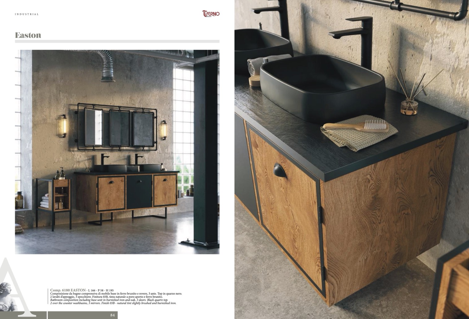 2 lavabi d’appoggio, 3 specchiere. Finitura 03B, tinta naturale a poro aperto e ferro brunito.