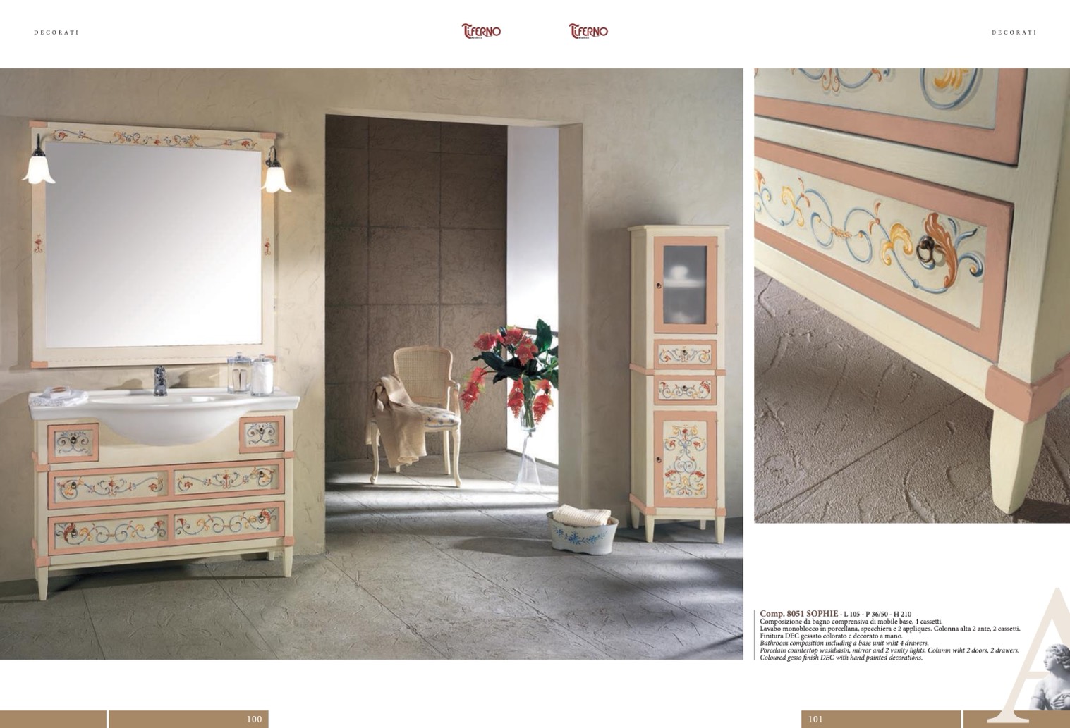 Lavabo monoblocco in porcellana, specchiera e 2 appliques. Colonna alta 2 ante, 2 cassetti.