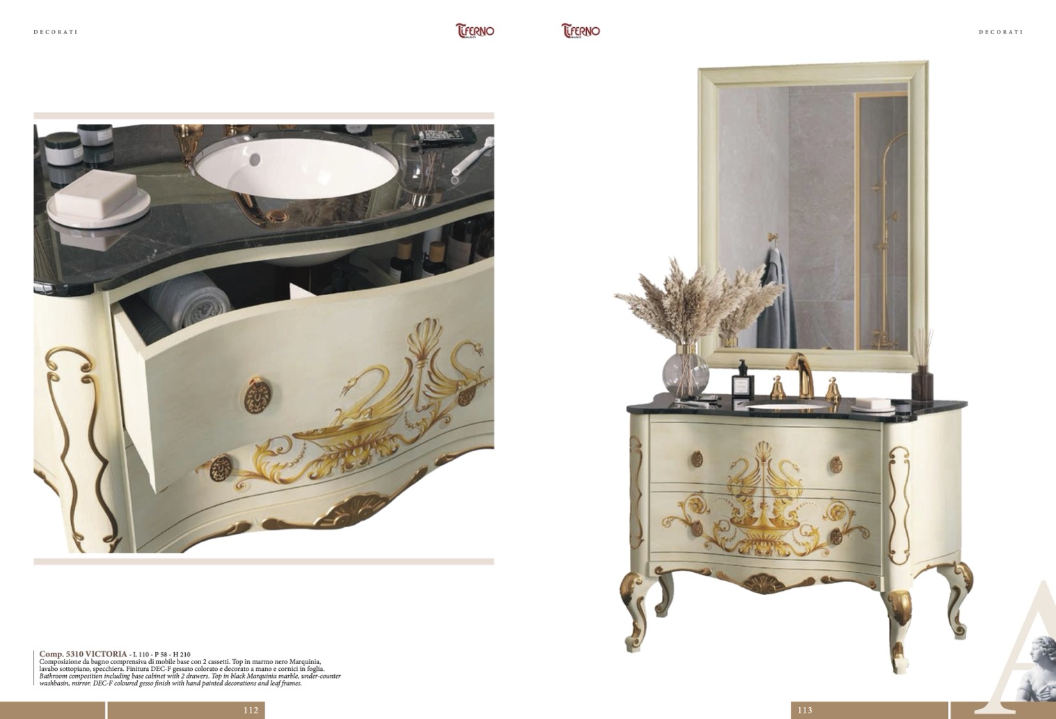 lavabo sottopiano, specchiera. Finitura DEC-F gessato colorato e decorato a mano e cornici in foglia.