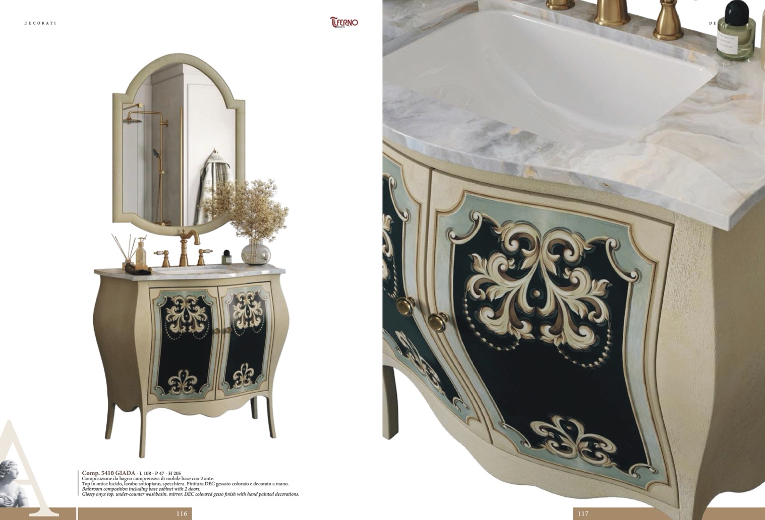 Top in onice lucido, lavabo sottopiano, specchiera. Finitura DEC gessato colorato e decorato a mano.