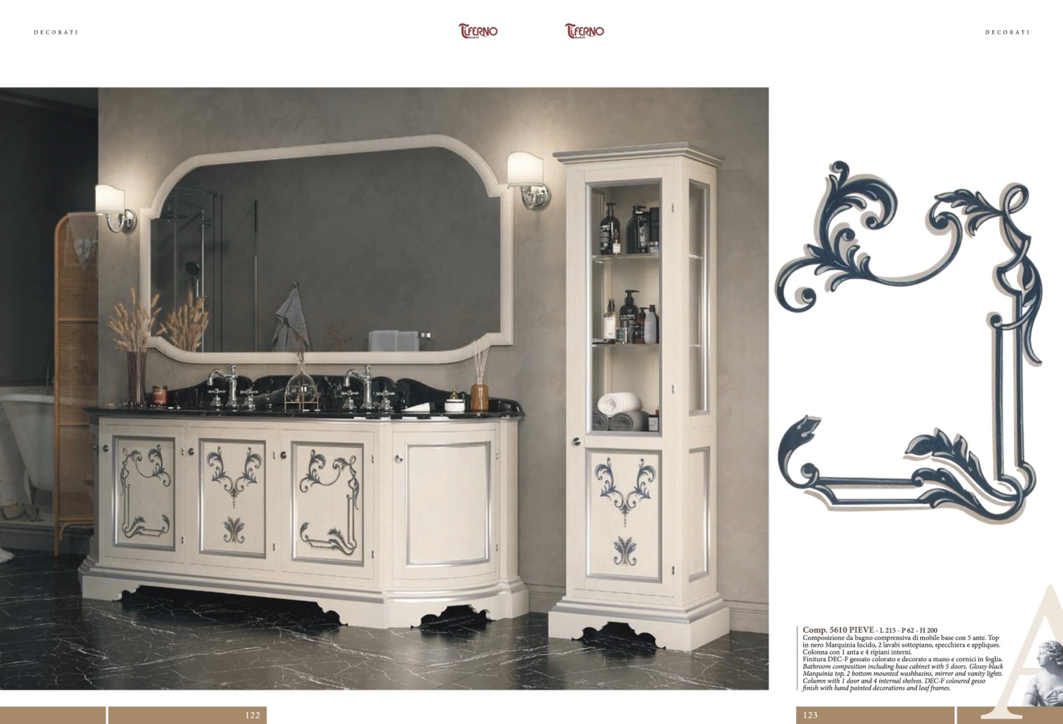 Finitura DEC-F gessato colorato e decorato a mano e cornici in foglia.