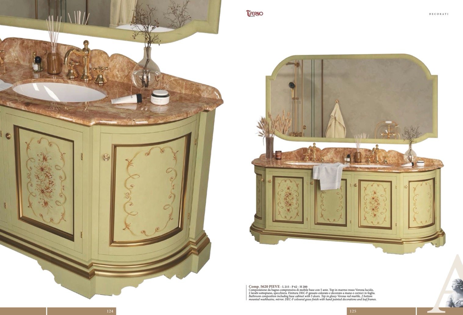 2 lavabi sottopiano, specchiera. Finitura DEC-F gessato colorato e decorato a mano e cornici in foglia.