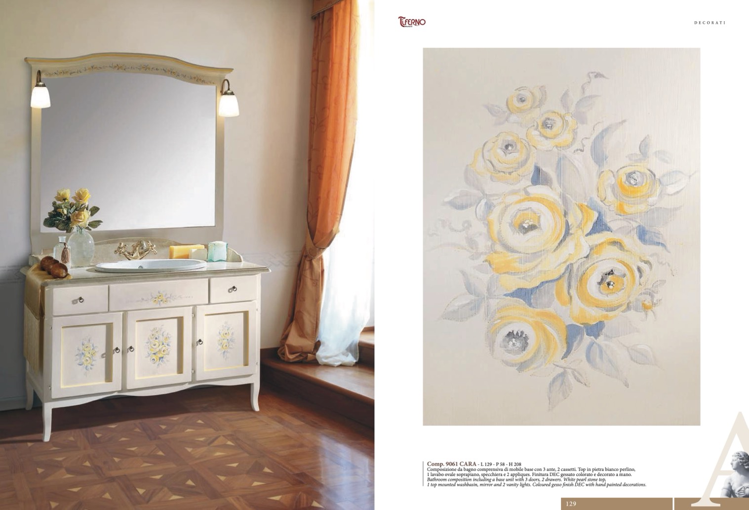 1 lavabo ovale soprapiano, specchiera e 2 appliques. Finitura DEC gessato colorato e decorato a mano.