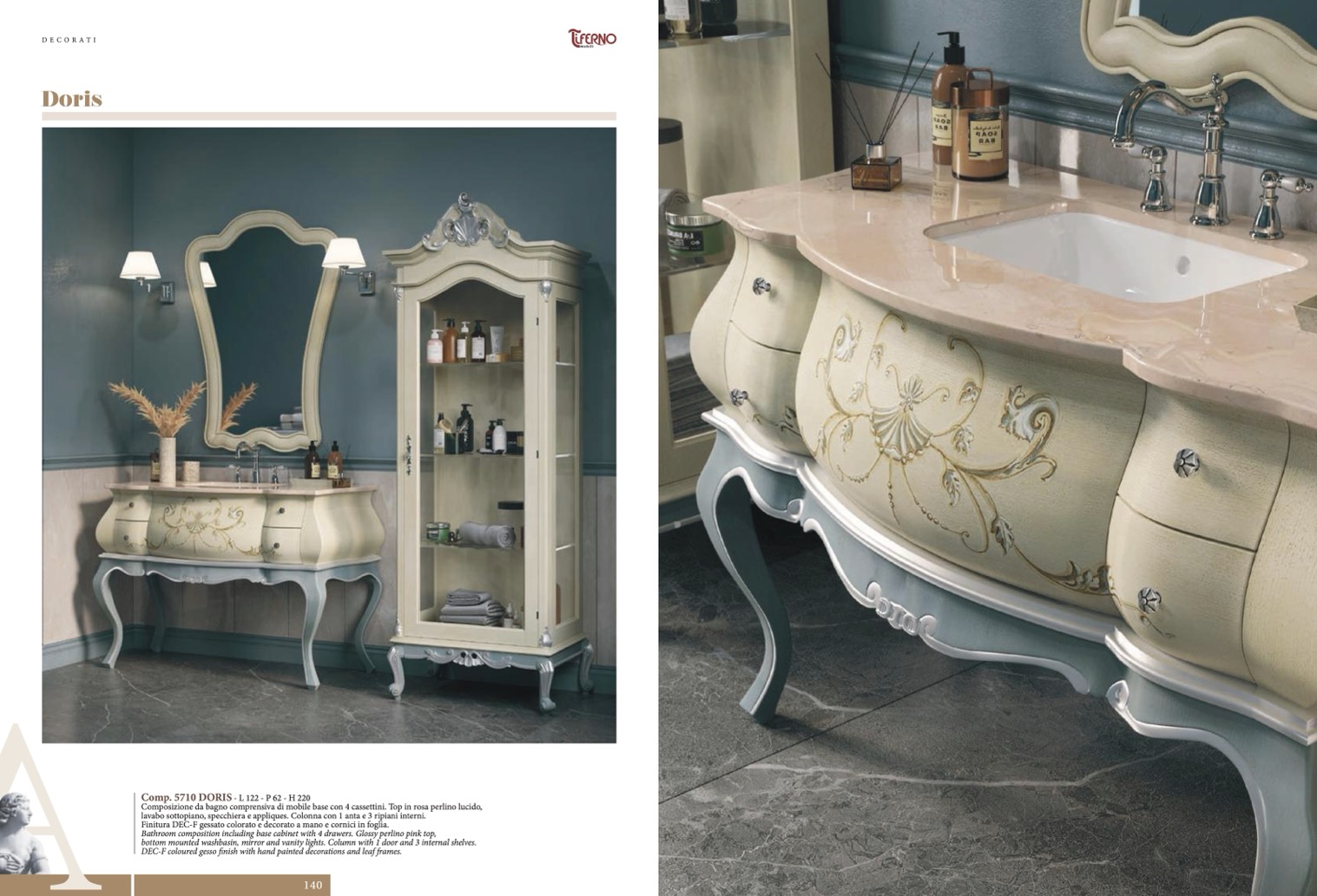 Finitura DEC-F gessato colorato e decorato a mano e cornici in foglia.