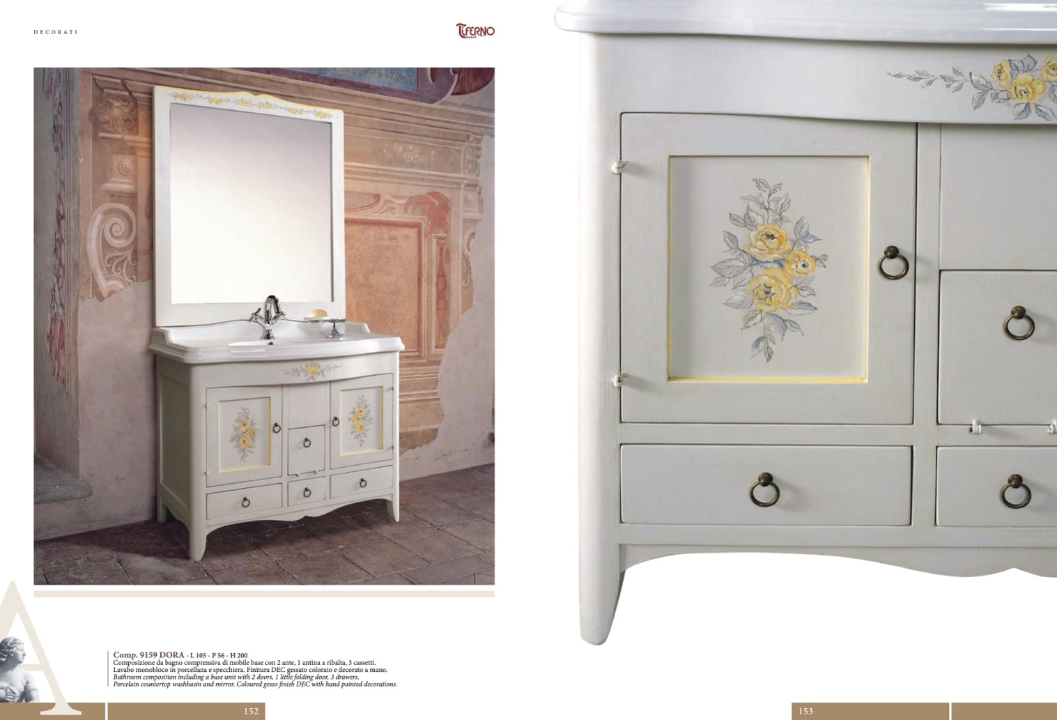 Lavabo monobloco in porcellana e specchiera. Finitura DEC gessato colorato e decorato a mano.