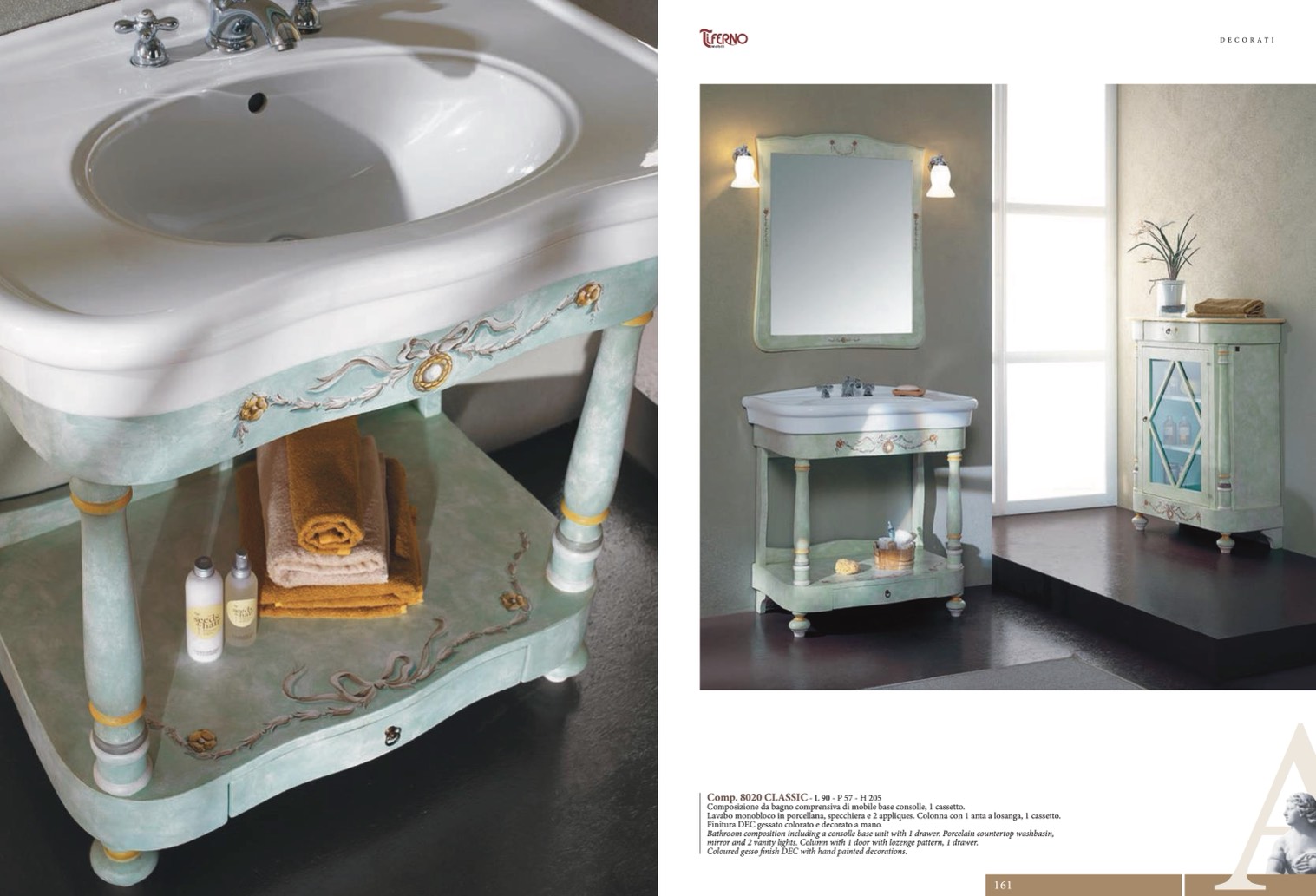 Lavabo monobloco in porcellana, specchiera e 2 appliques. Colonna con 1 anta a losanga, 1 cassetto.