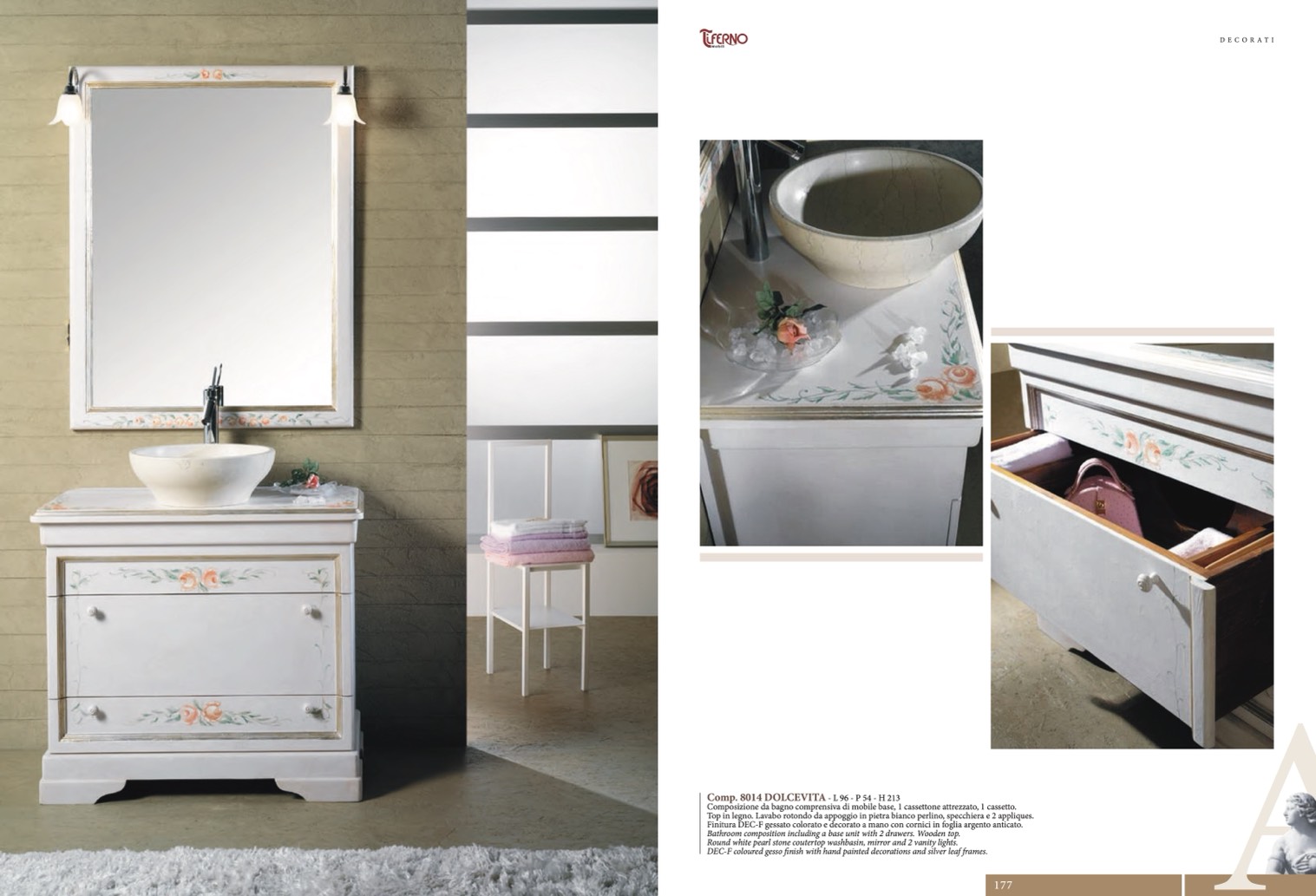 Top in legno. Lavabo rotondo da appoggio in pietra bianco perlino, specchiera e 2 appliques.