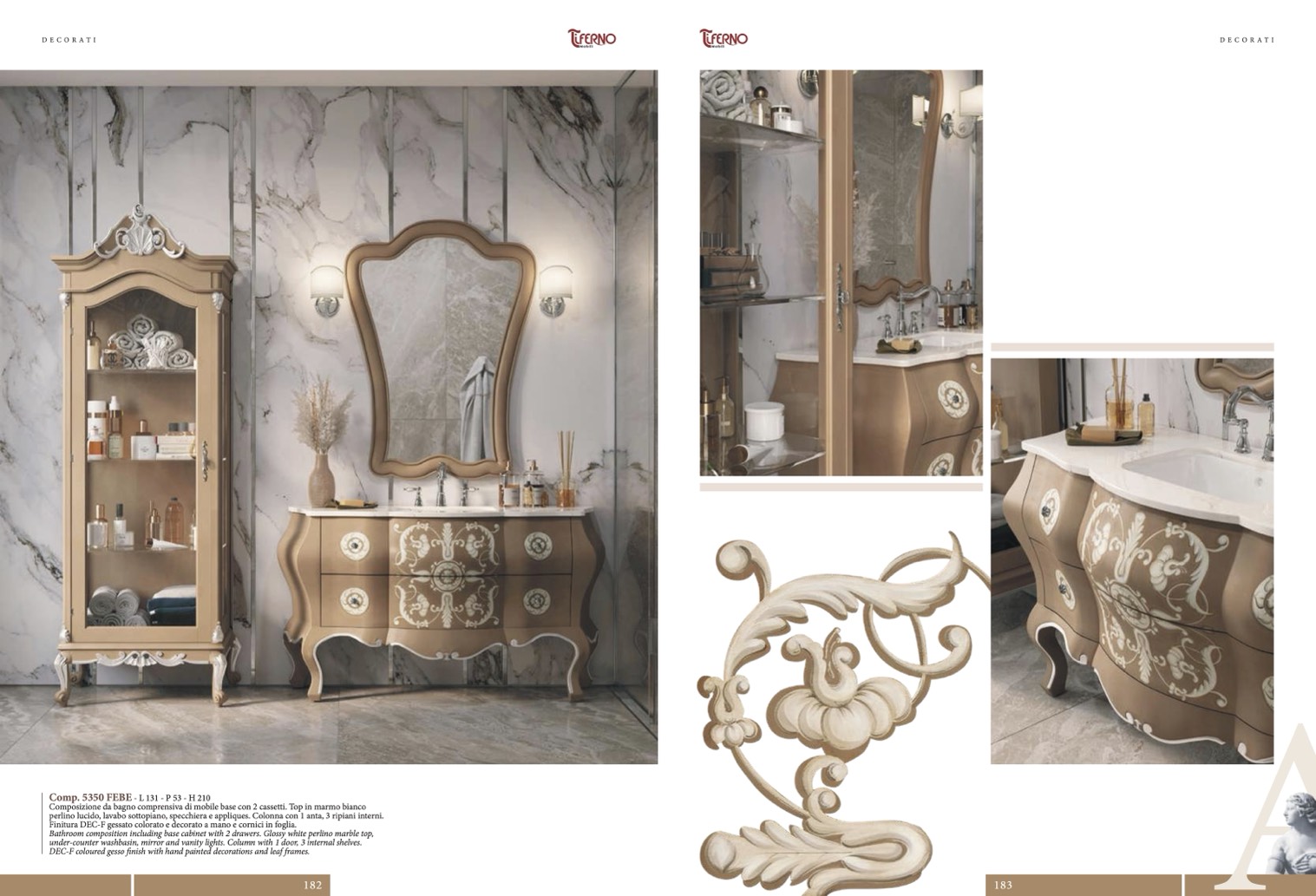 Bathroom composition including base cabinet with 2 drawers. Glossy white perlino marble top,