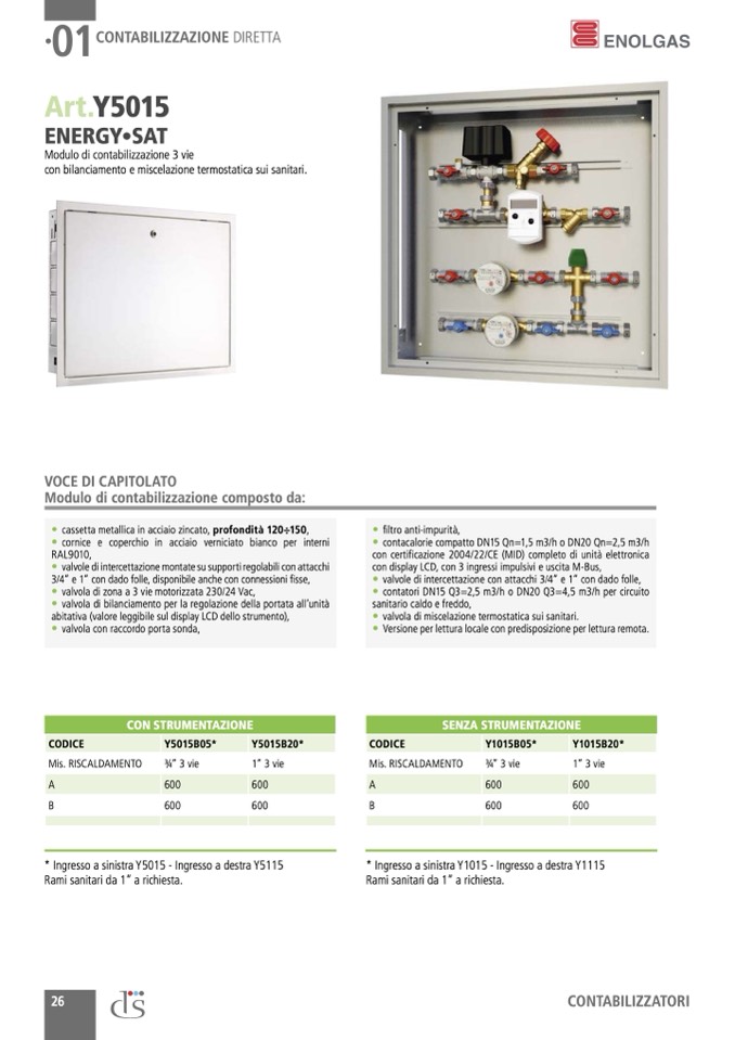 • contacalorie compatto DN15 Qn=1,5 m3/h o DN20 Qn=2,5 m3/h
