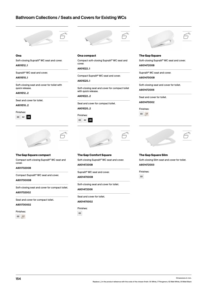 Replace (..) in the product reference with the code of the chosen finish: 00 White, 17 Pergamon, 62 Matt White, 08 Matt Black