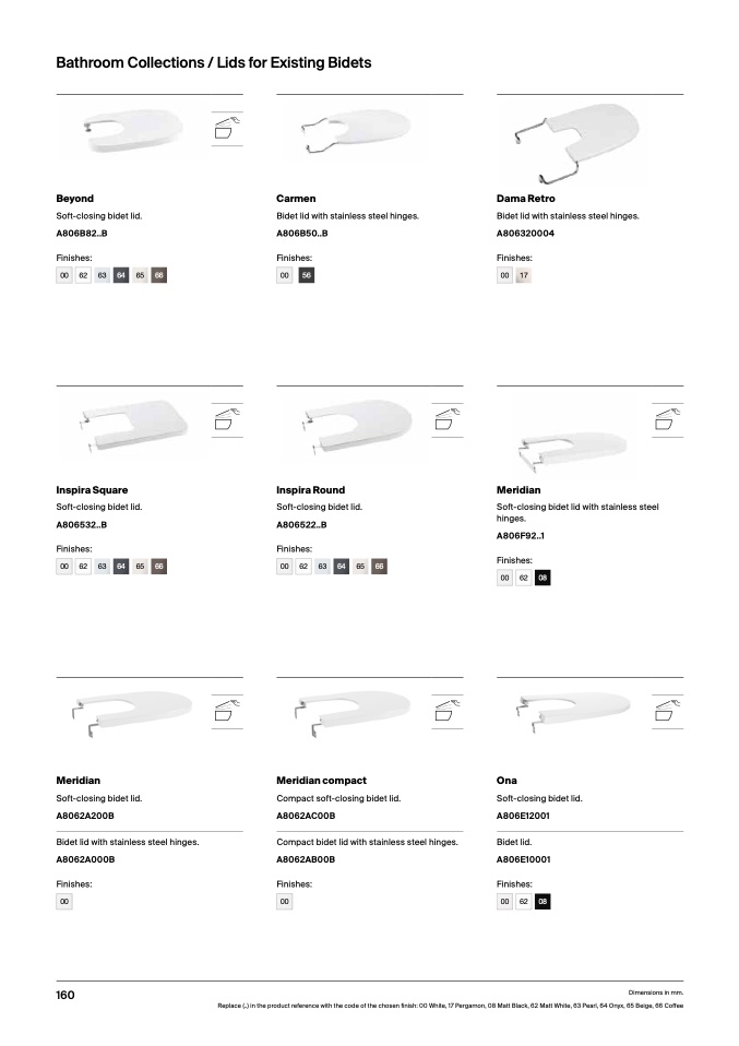 Replace (..) in the product reference with the code of the chosen finish: 00 White, 17 Pergamon, 08 Matt Black, 62 Matt White, 63 Pearl, 64 Onyx, 65 Beige, 66 Coffee