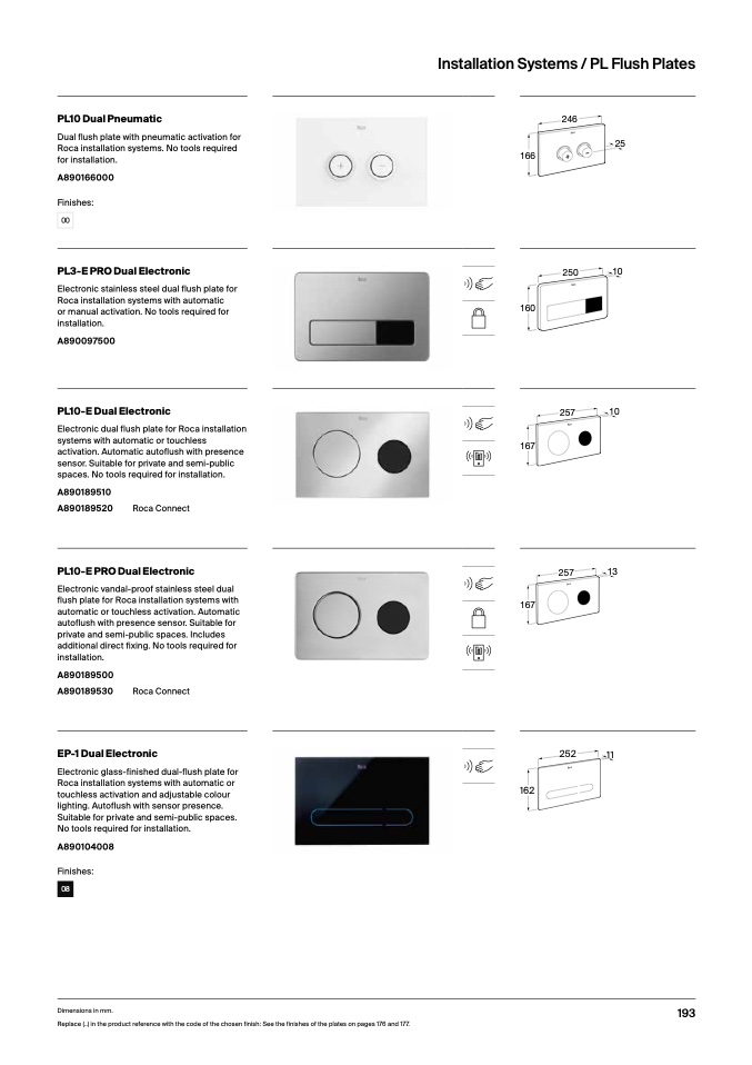Replace (..) in the product reference with the code of the chosen finish: See the finishes of the plates on pages 176 and 177