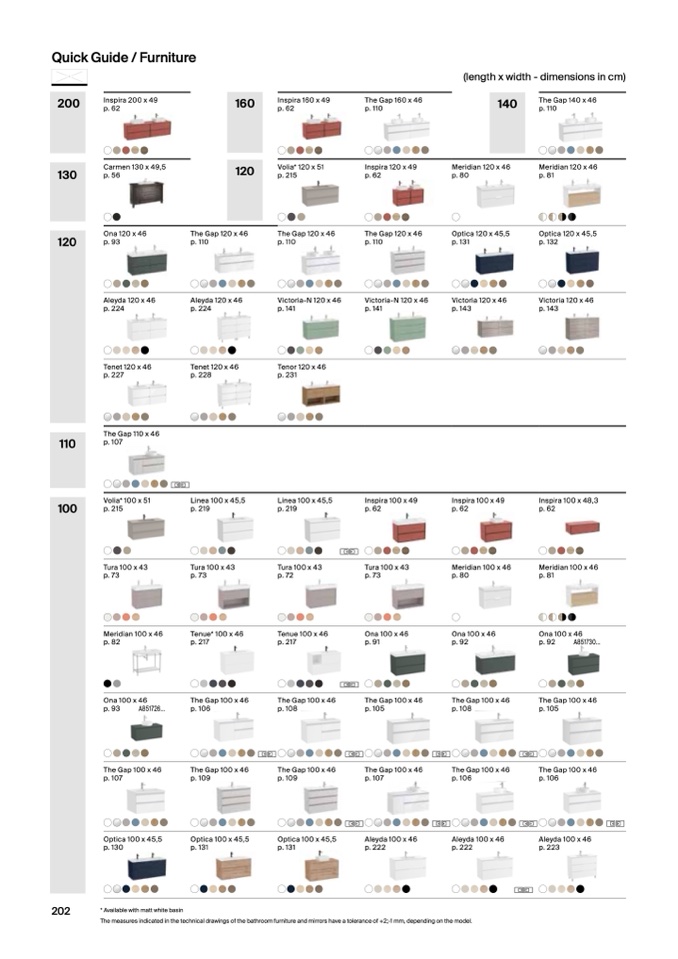 The measures indicated in the technical drawings of the bathroom furniture and mirrors have a tolerance of +2;-1 mm, depending on the model.