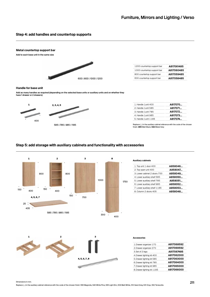 Replace (...) in the auxiliary cabinet reference with the code of the chosen finish: 556 Magnolia, 546 White Pine, 565 Light Elm, 509 Matt White, 510 Sand Grey, 531 Onyx, 552 Terracott
