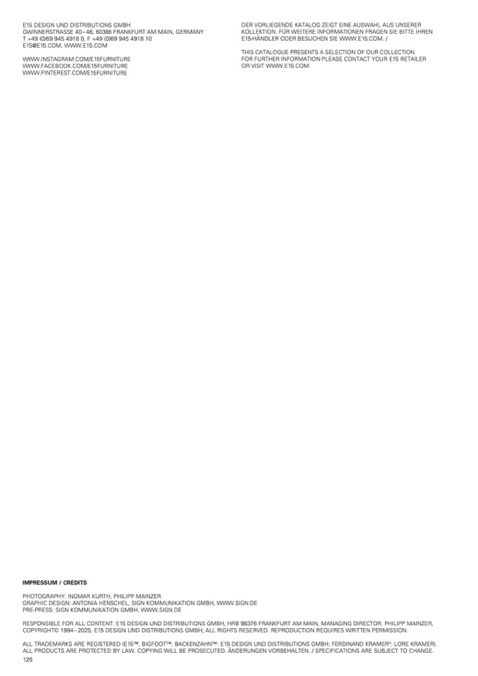 RESPONSIBLE FOR ALL CONTENT: E15 DESIGN UND DISTRIBUTIONS GMBH, HRB 98376 FRANKFURT AM MAIN, MANAGING DIRECTOR: PHILIPP MAINZER,