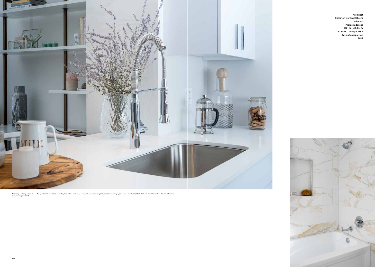The easy, contemporary vibe of the apartments is embodied in the gloss white kitchen spaces, with open shelving and seamless worktops, plus super-practical GROHE K7 Semi-Pro kitchen faucets with a