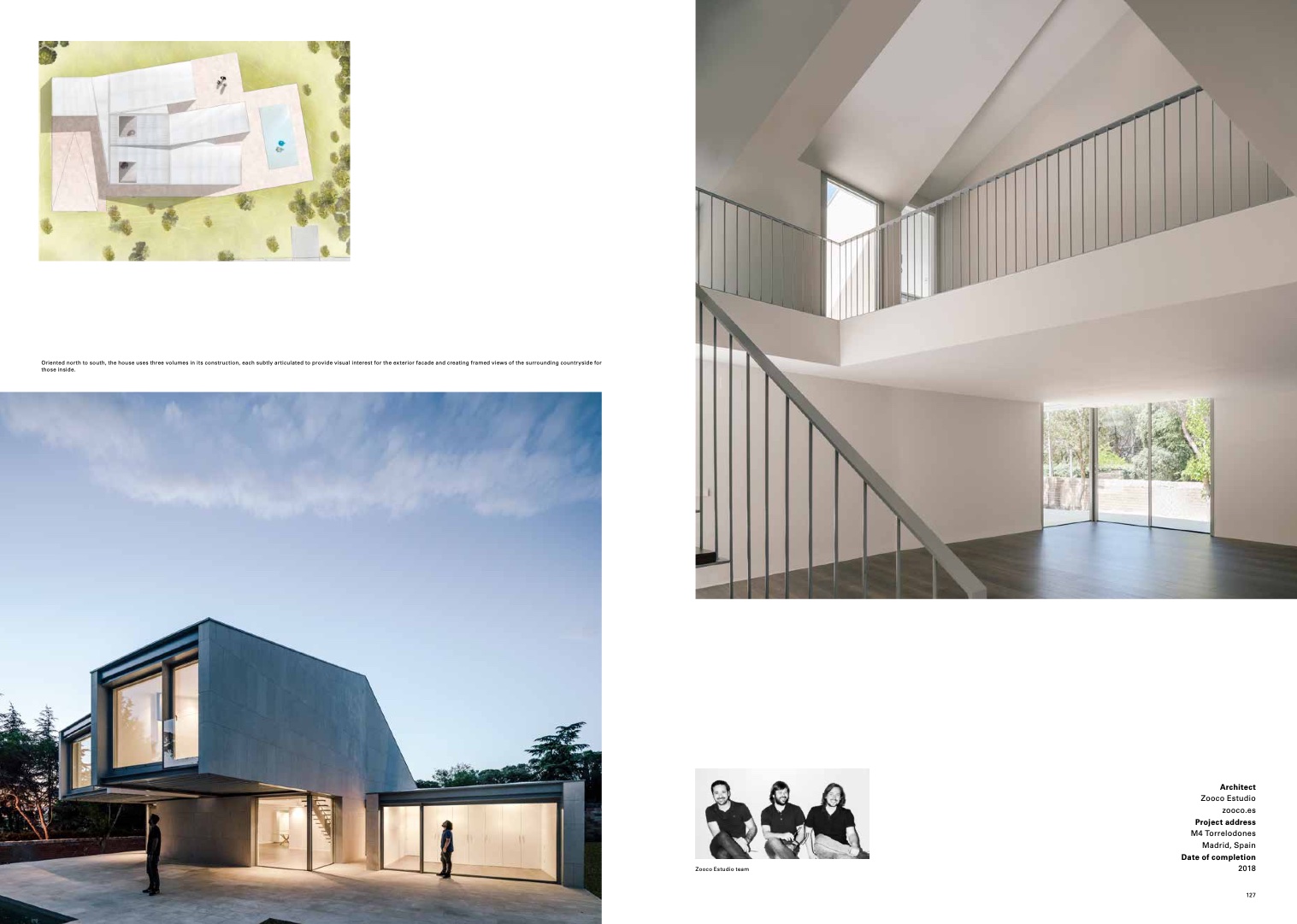 Oriented north to south, the house uses three volumes in its construction, each subtly articulated to provide visual interest for the exterior facade and creating framed views of the surrounding countryside for