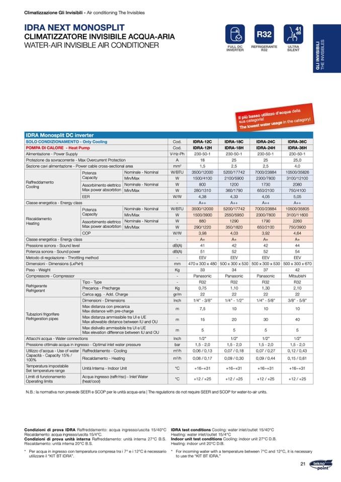 N.B.: la normativa non prevede SEER e SCOP per le unità acqua-aria | The regulations do not require SEER and SCOP for water-to-air units.