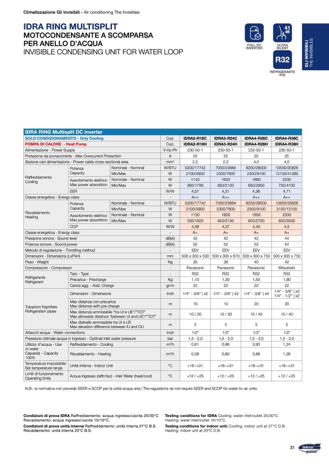 N.B.: la normativa non prevede SEER e SCOP per le unità acqua-aria | The regulations do not require SEER and SCOP for water-to-air units.