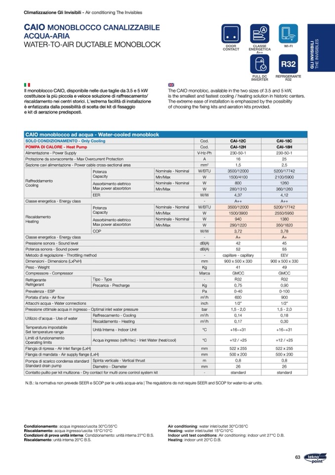 N.B.: la normativa non prevede SEER e SCOP per le unità acqua-aria | The regulations do not require SEER and SCOP for water-to-air units.